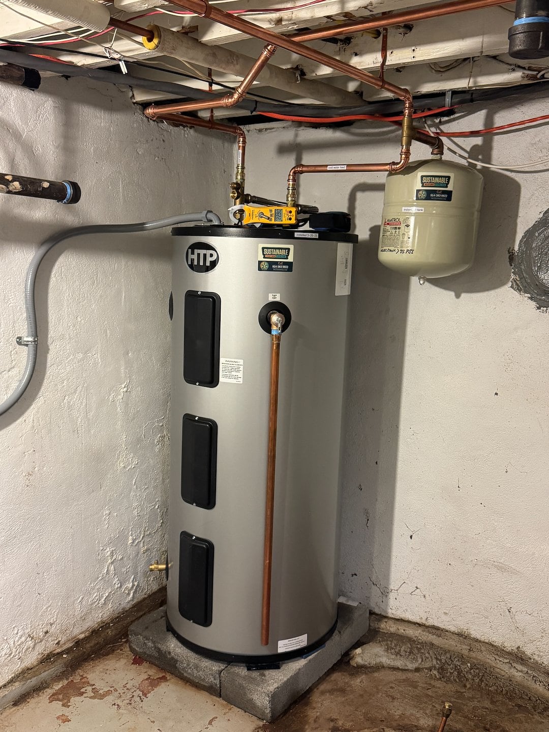 We installed an HTP Elevate electric water heater, a powerful and efficient unit designed for high-demand households. When paired with a mixing valve, this system delivers hot water comparable to a 100-gallon gas water heater — but without the emissions, fuel storage, or combustion risks.